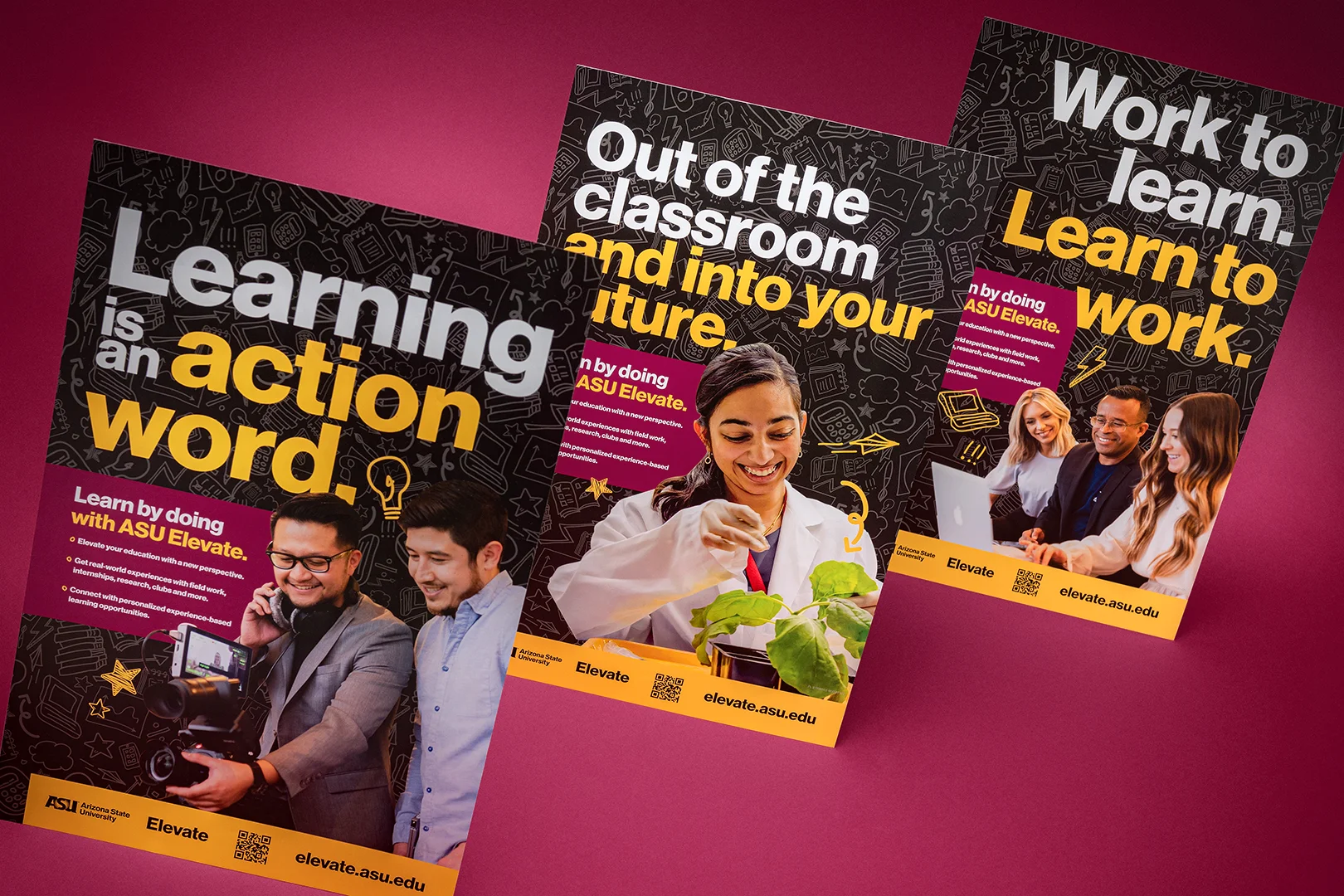 Partnering with ASU’s University College, we transformed the Experiential Learning program into ASU Elevate—a cohesive platform designed to inspire engagement and bring together students, creators, connectors, and leadership. The new name reflects the program’s purpose: elevating student opportunities through hands-on learning experiences. The program branding included a redesigned website, digital banners, promotional assets, and a full suite of social media content.