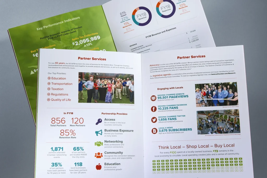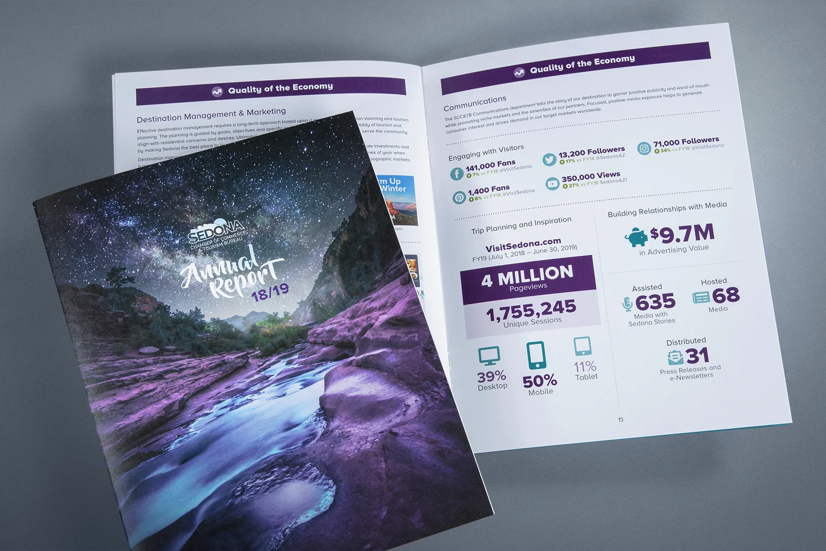 The Sedona Chamber of Commerce & Tourism Bureau engaged Esser Design to support its broad marketing and communications efforts across the organization and its affiliates. Our work spans the development of cohesive brand materials—from brochures and annual reports to advertising, infographics, and event collateral—helping the Chamber maintain a consistent and compelling presence across all audience touchpoints.