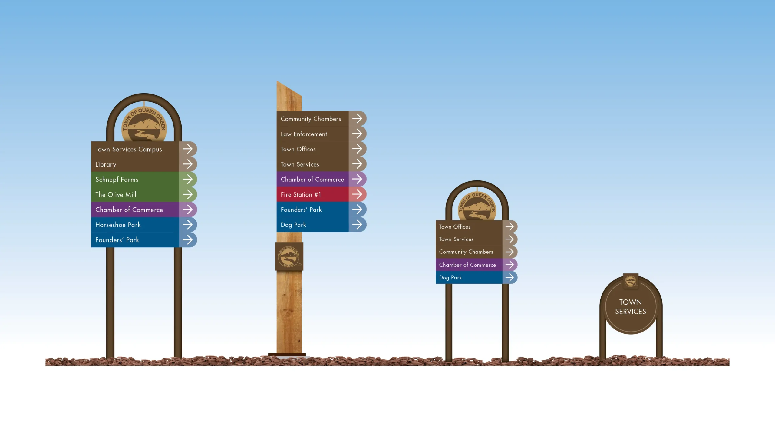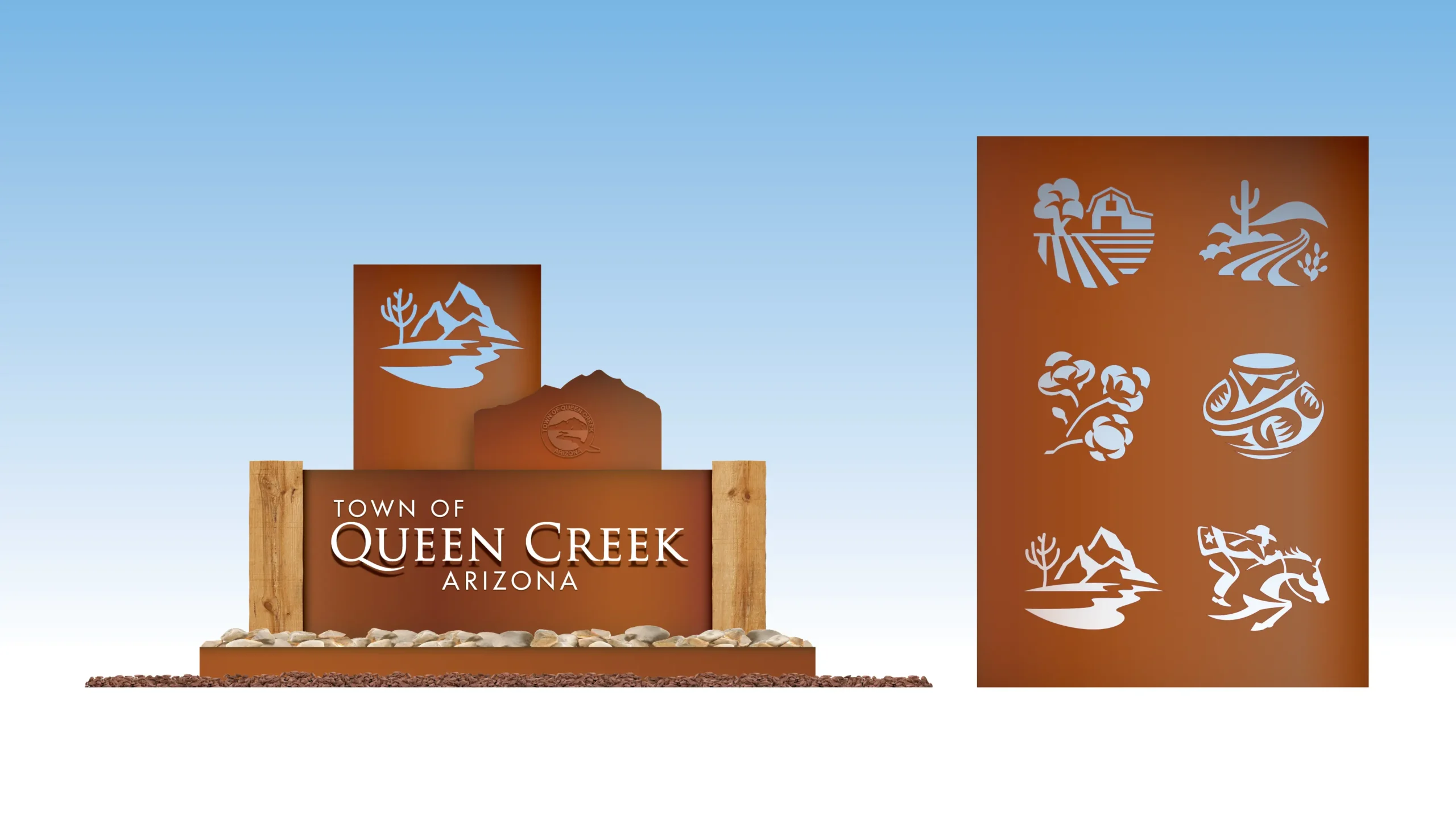 Entry monuments and wayfinding signage create a cohesive visual identity that honors Queen Creek’s heritage and landscape. Drawing inspiration from the town’s agricultural and desert roots, the designs use clear typography and intuitive icons to ensure both functionality and civic pride throughout public spaces.