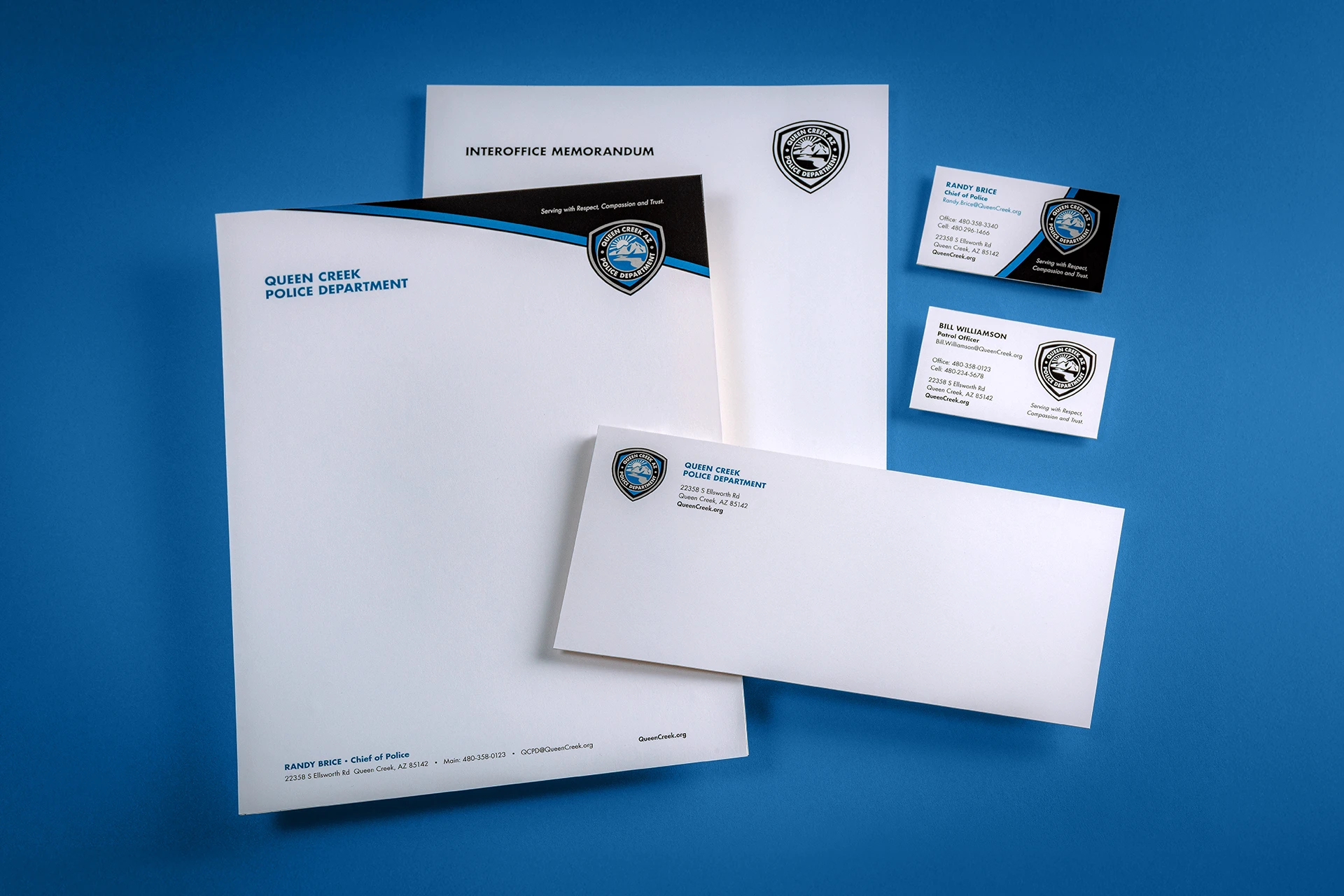 The Queen Creek Police Department’s new brand was designed to convey professionalism, community partnership, and the town’s strong local identity. Approved by the Town Council, the visual system features a distinctive logo with cohesive applications across vehicles, uniforms, and signage.